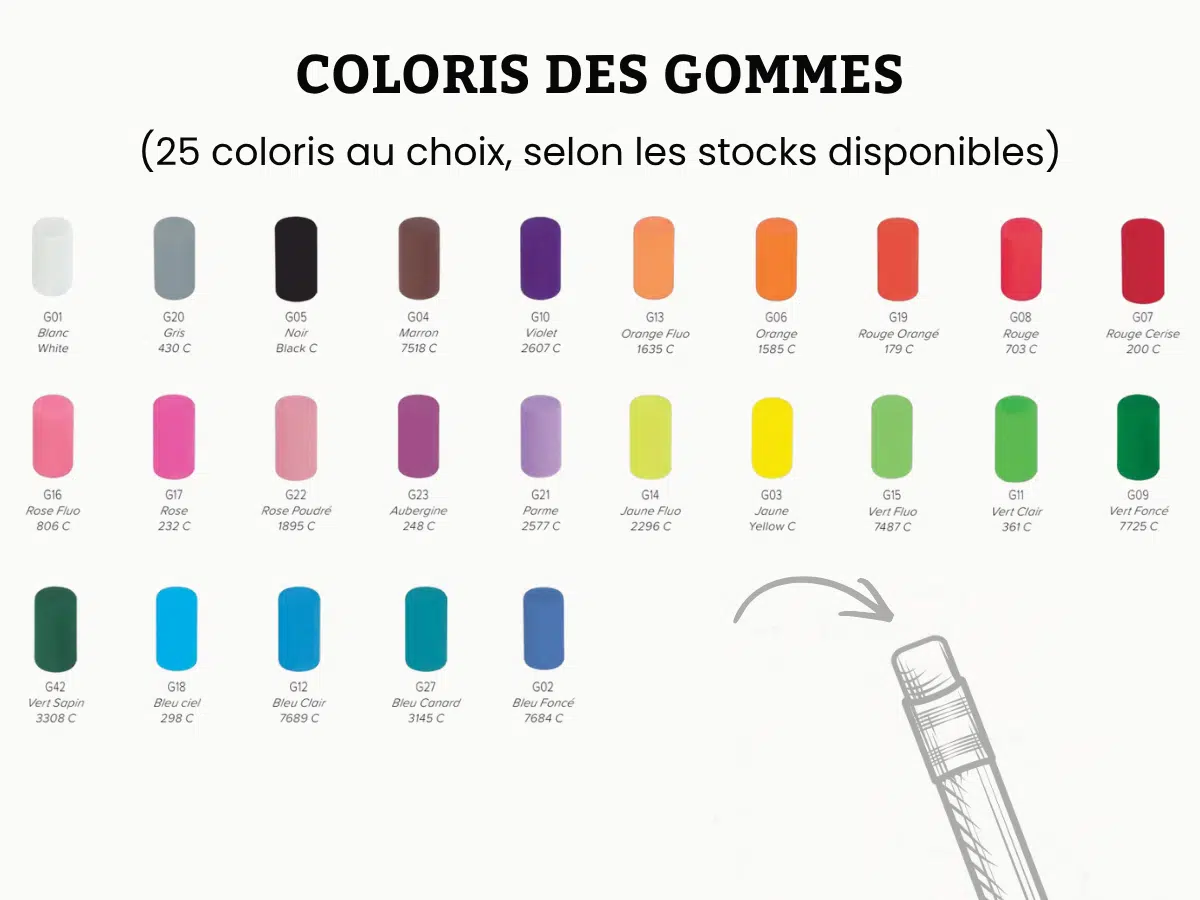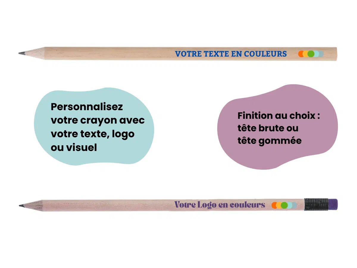 Disponible avec tête coupée ou avec gomme (virole métallique + gomme colorée au choix selon stock), il s’adapte à vos préférences et à votre image.