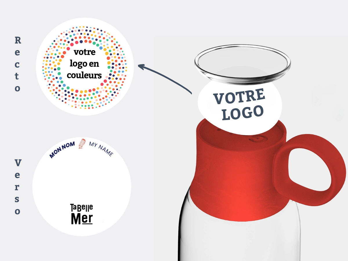 Elle est personnalisable avec votre logo, visuel ou texte en couleurs quadri au niveau de la carte ronde clipsée sur le bouchon.