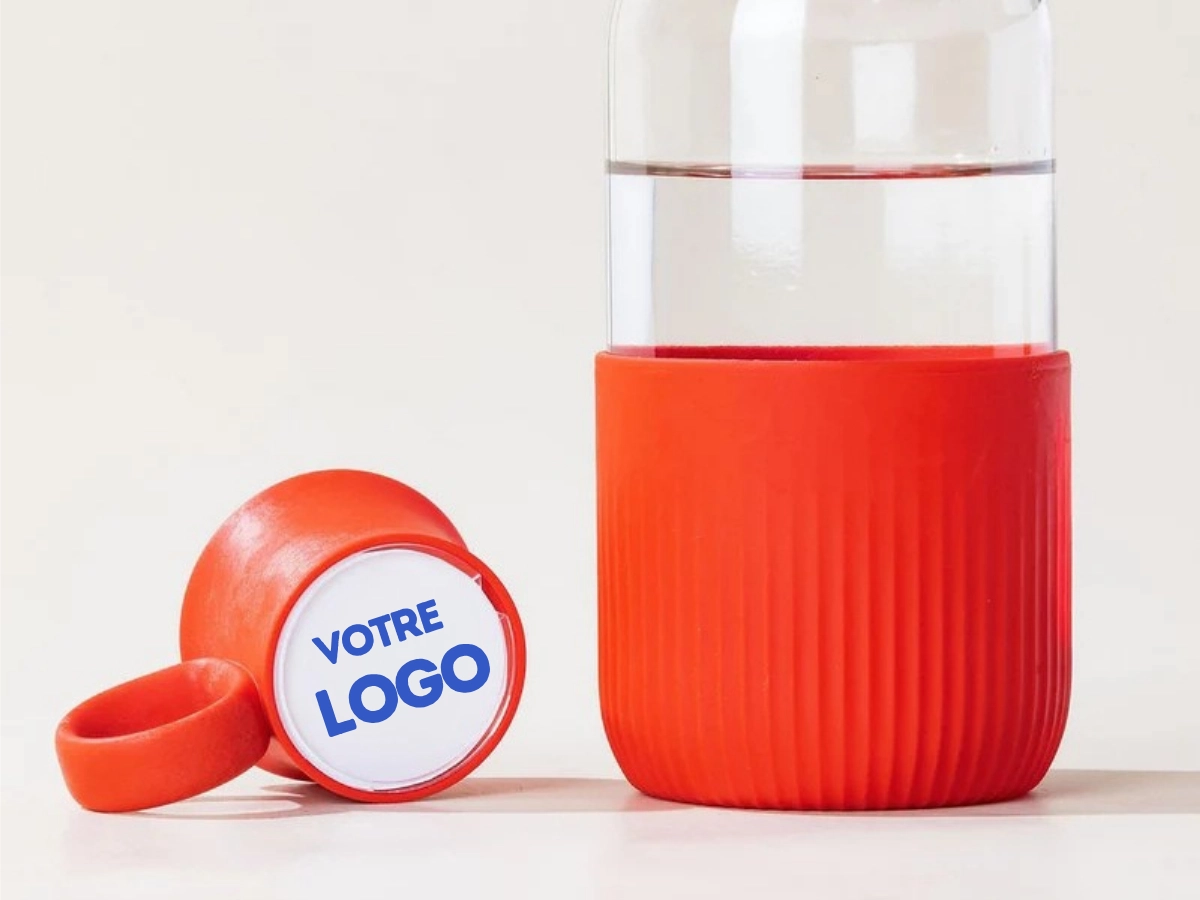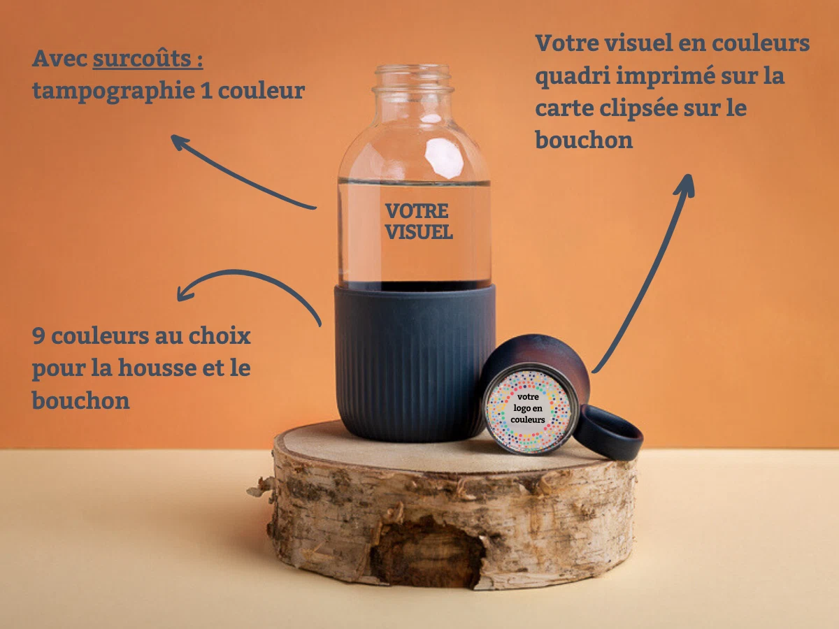 Au bureau, en réunion ou en déplacement, cette gourde en verre personnalisée Made in France remplace naturellement les bouteilles plastiques.