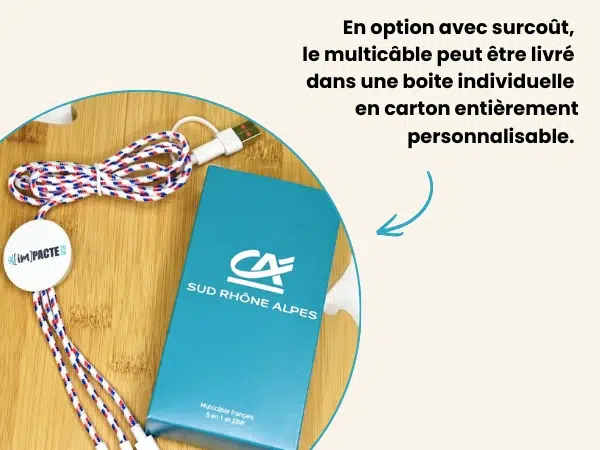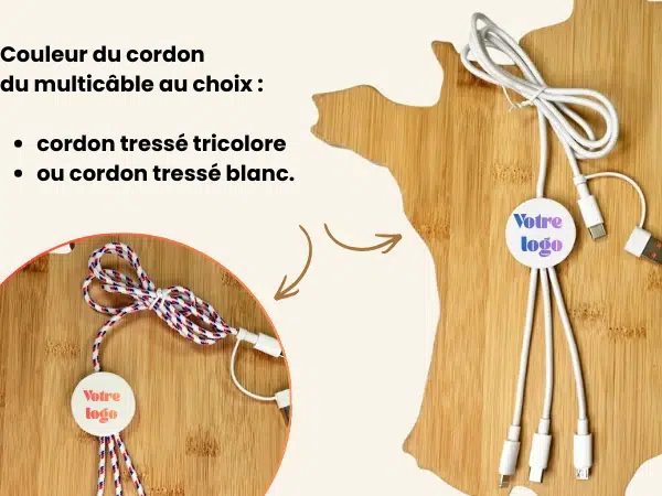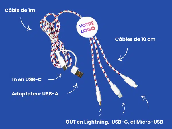 Fabriqué et personnalisé en Drôme, labellisé Origine France Garantie, ce multicâble 5 en 1 personnalisé est un véritable goodies tech Made in France.
