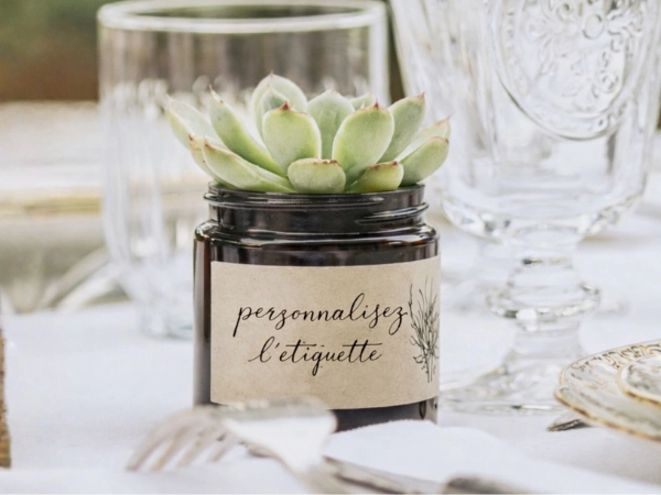 Le pot en verre et l’étiquette kraft apportent une touche naturelle et élégante à une ambiance bohème et authentique.